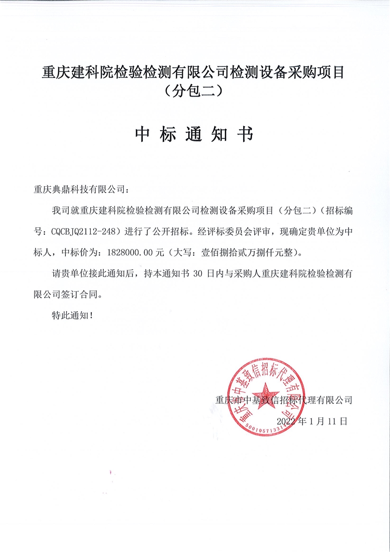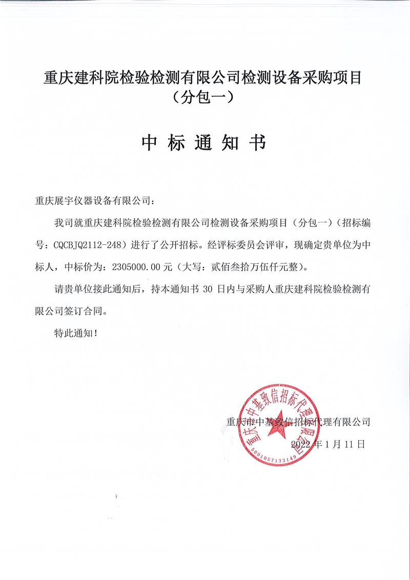 重慶建科院檢驗檢測有限公司委托重慶市中基致信招標(biāo)代理有限公司對我公司檢測設(shè)備采購項目(項目號:CQCBJQ2112-248 )分包一(力學(xué))和分包二(化學(xué))進(jìn)行了公開招標(biāo)采購,現(xiàn)已完成全部采購程序。確認(rèn)重慶展宇儀器設(shè)備有限公司為分包一(力學(xué))中標(biāo)人,中標(biāo)價為2305000元(貳佰參拾萬伍仟佰元整)。確認(rèn)重慶典鼎科技有限公司為分包二(化學(xué))中標(biāo)人,中標(biāo)價為1828000元(壹佰捌拾貳萬捌仟元整)。