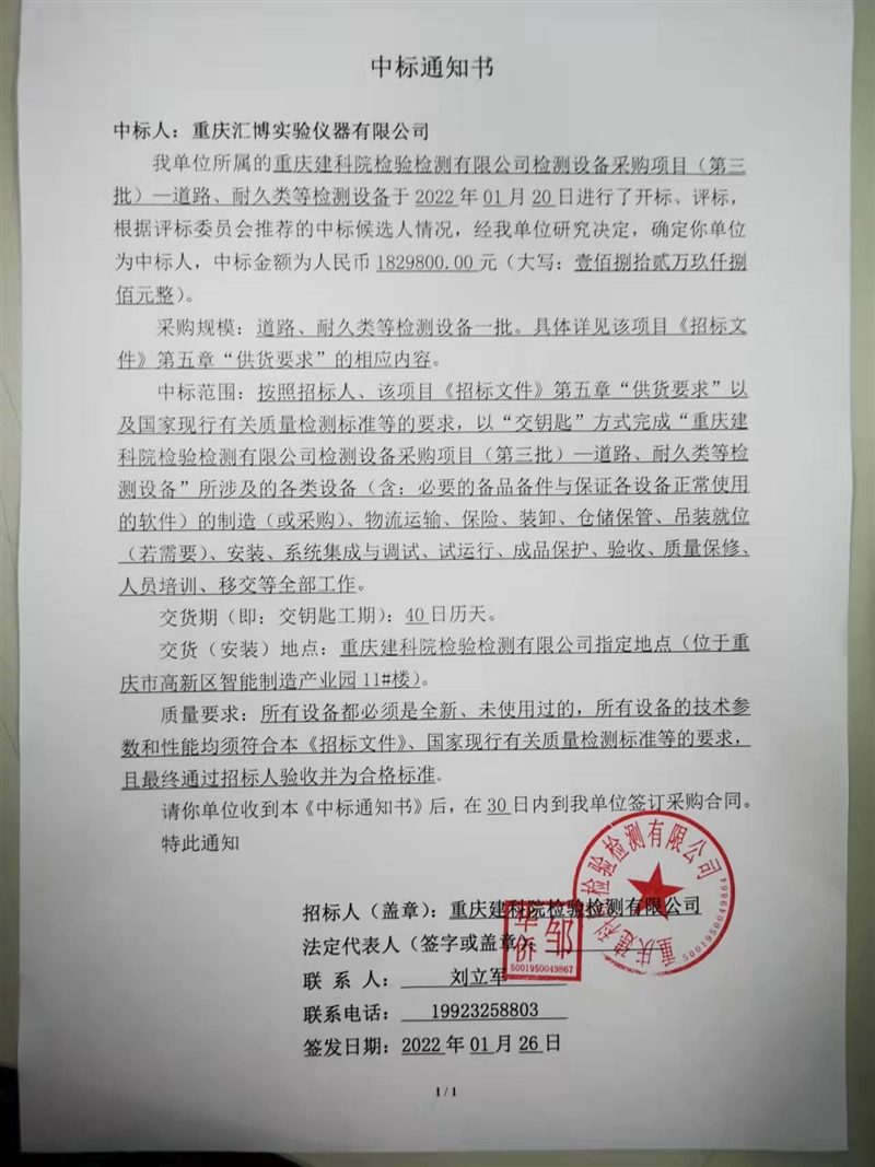 重慶建科院檢驗(yàn)檢測(cè)有限公司委托中招國(guó)際招標(biāo)有限公司對(duì)我公司檢測(cè)設(shè)備采購(gòu)項(xiàng)目(項(xiàng)目號(hào):TC219D1RL )重慶建科院檢驗(yàn)檢測(cè)有限公司檢測(cè)設(shè)備采購(gòu)項(xiàng)目(第三批)—道路、耐久類等檢測(cè)設(shè)備進(jìn)行了公開(kāi)招標(biāo)采購(gòu),現(xiàn)已完成全部采購(gòu)程序。確認(rèn)重慶匯博實(shí)驗(yàn)儀器設(shè)備有限公司為檢測(cè)設(shè)備采購(gòu)項(xiàng)目(第三批)—道路、耐久類等檢測(cè)設(shè)備中標(biāo)人,中標(biāo)價(jià)為1829800.00元(大寫:壹佰捌拾貳萬(wàn)玖仟捌佰元整)。