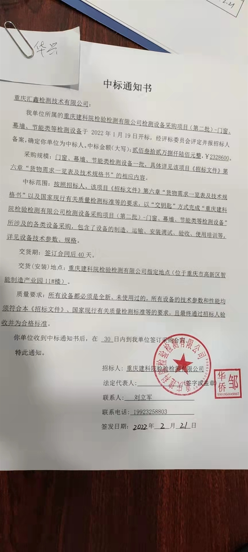 重慶建科院檢驗(yàn)檢測有限公司委托重慶華興工程咨詢有限公司對我公司檢測設(shè)備采購項(xiàng)目(項(xiàng)目號:HXZX-2021-30 )重慶建科院檢驗(yàn)檢測有限公司檢測設(shè)備(第二批)-門窗、幕墻、節(jié)能類等檢測設(shè)備進(jìn)行了公開招標(biāo)采購,現(xiàn)已完成全部采購程序。確認(rèn)重慶匯鑫檢測技術(shù)有限公司為檢測設(shè)備(第二批)-門窗、幕墻、節(jié)能類等檢測設(shè)備采購項(xiàng)目中標(biāo)人,中標(biāo)價(jià)為2328600元(大寫:貳佰叁拾貳萬捌仟陸佰元整)。