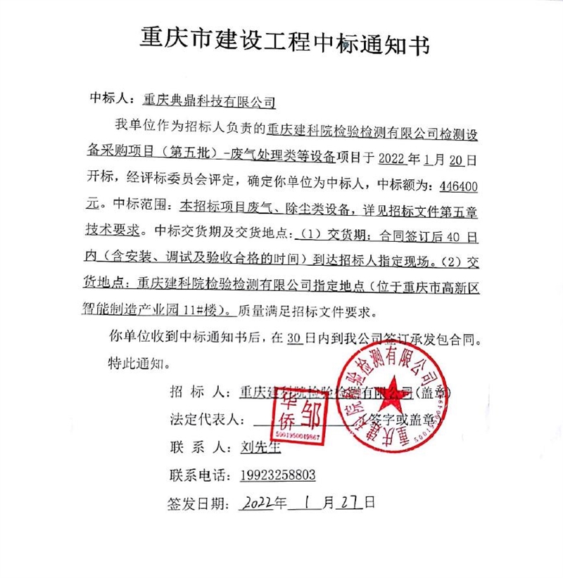 重慶建科院檢驗(yàn)檢測(cè)有限公司委托重慶市工程管理有限公司對(duì)我公司檢測(cè)設(shè)備采購(gòu)項(xiàng)目(項(xiàng)目號(hào):CQEM-ZB-22002 )重慶建科院檢驗(yàn)檢測(cè)有限公司檢測(cè)設(shè)備采購(gòu)項(xiàng)目(第五批)-廢氣處理類等設(shè)備進(jìn)行了公開招標(biāo)采購(gòu),現(xiàn)已完成全部采購(gòu)程序。確認(rèn)重慶典鼎科技有限公司為檢測(cè)設(shè)備采購(gòu)項(xiàng)目(第五批)-廢氣處理類等設(shè)備采購(gòu)項(xiàng)目中標(biāo)人,中標(biāo)價(jià)為446400元(大寫:肆拾肆萬(wàn)陸仟肆佰元整)。