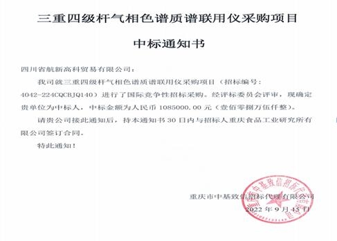 重慶食品工業(yè)研究所有限公司委托重慶市中基致信招標(biāo)代理有限公司對(duì)三重四級(jí)桿氣相色譜質(zhì)譜聯(lián)用儀采購(gòu)項(xiàng)目(招標(biāo)編號(hào):4042-224CQCBJQ140)進(jìn)行國(guó)際競(jìng)爭(zhēng)性招標(biāo)采購(gòu),現(xiàn)已完成全部采購(gòu)程序。確定中標(biāo)人四川省航新高科貿(mào)易有限公司,中標(biāo)金額為人民幣1085000.00元(壹佰零捌萬(wàn)伍仟整)。