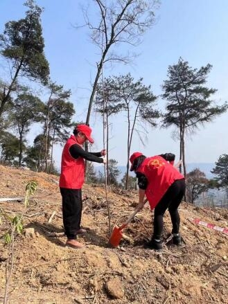 此次植樹點位于縉云山歇馬街道“8.21”山火發(fā)生地,2022年,重慶歷經(jīng)“8.21”山火考驗,需通過人工造林對受災(zāi)區(qū)域進行修復(fù)。半年后,春風(fēng)又綠縉云山,伴隨驕陽,第一黨支部全體黨員同志們身穿紅馬甲,頭戴“小紅帽”,到達植樹點后揮鍬挖土、扶正樹苗、填土夯苗、堆砌圍堰、澆水灌溉......接連種下一棵棵木荷樹、楓香樹。現(xiàn)場一片繁忙景象,其樂融融、氣氛熱烈。