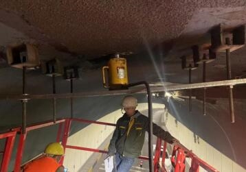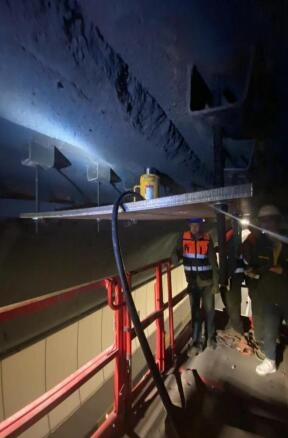 該項檢測工作時間緊、任務(wù)重,檢測操作難度較大。為了更好地完成檢測工作,公司立即組織相關(guān)人員成立專項技術(shù)小組并召開技術(shù)論證會,隨后及時安排人員開展現(xiàn)場檢測工作,由于該隧道交通通行壓力較大,檢測工作選擇在晚上10點后進(jìn)行,并協(xié)調(diào)重慶市渝中區(qū)交警支隊進(jìn)行交通導(dǎo)行,在移動吊車、自卸式起重車等多種特種作業(yè)設(shè)備的支持下,爭分奪秒,于凌晨3點順利完成了風(fēng)機吊架承載力檢測工作。