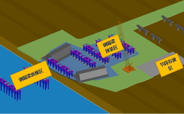 為避免河道水資源污染,確保航道通暢,箱梁采用整節(jié)段拼裝、頂推施工工藝。主橋鋼結(jié)構(gòu)現(xiàn)場施工分為鋼箱梁頂推和拱肋吊裝兩部分,鋼箱梁塊段運(yùn)輸至現(xiàn)場的拼裝支架上組拼成大塊段節(jié)段,焊接完成整體后進(jìn)行頂推施工(鋼箱梁頂推施工期間, 18#、21#墩引橋側(cè)高蓋梁暫不施工,主橋側(cè)支座墊石正常施工),依次循環(huán),直至鋼箱梁全部頂推完成。拱肋放置于鋼箱梁對應(yīng)位置一同頂推到位,鋼箱梁整體落梁至頂推臨時支架上,2臺400t履帶吊上橋進(jìn)行拱肋支架安裝和拱肋安裝。過程中通過整體頂推設(shè)備控制程序自動調(diào)節(jié),確保設(shè)備的協(xié)調(diào)同步。