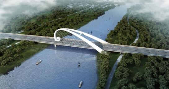 香河縣安石路(運(yùn)河大道-冀京界段)建設(shè)工程是《北京市通州區(qū)與河北省三河、大廠、香河三縣市協(xié)同發(fā)展規(guī)劃》的重點(diǎn)工程,也是北運(yùn)河廊坊段旅游通航的重要組成部分,路線全長3.624公里,采用一級公路兼城市主干路標(biāo)準(zhǔn)建設(shè),道路標(biāo)準(zhǔn)橫斷面采用四幅路形式,雙向六條機(jī)動車道,外設(shè)非機(jī)動車道和人行道,路基寬47米。其中橋梁段(即王家擺大橋)長1060.1米(主橋長256米,引橋長804.1米),采用抱翅型拱梁組合體系,由“Λ”字抱翅外形的空間異形主拱拱圈、拱圈內(nèi)與主梁連接的斜吊桿和主梁三大主體結(jié)構(gòu)組合而成,主梁半幅為整體鋼箱,半幅之間用橫梁連接,拉索錨固在抱翅拱和主梁的橫梁上,橋面板采用正交異性鋼橋面板。抱翅拱的一端在中央隔離帶處與主梁橫梁連接,下接中墩支座;抱翅拱的另一端成“Λ”形分布于主梁兩側(cè),通過橫梁與主梁連接。造型創(chuàng)意以如意型浪花為構(gòu)思元素,將運(yùn)河之水奔流涌動之態(tài)和如意的古典華美抽象融合,建成后將成為當(dāng)?shù)匾蛔鶚O富美感的景觀橋。