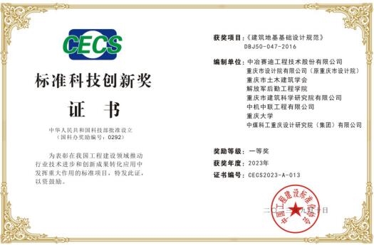 中國工程建設(shè)標準化協(xié)會標準科技創(chuàng)新獎是經(jīng)科技部國家科學技術(shù)獎勵工作辦公室批準的我國工程建設(shè)標準化領(lǐng)域首個專屬獎項,旨在表彰建筑建材、鐵路交通、水利電力、市政工程、機械電子等我國工程建設(shè)領(lǐng)域推動行業(yè)技術(shù)進步和創(chuàng)新成果轉(zhuǎn)化應(yīng)用中發(fā)揮重大作用的標準項目、單位和個人。市建科院公司副總經(jīng)理、總工程師張京街從事建設(shè)工程質(zhì)量檢測工作39年,兼任重慶市建筑行業(yè)專家?guī)鞂<遥恢鞒?/span>、參與編制標準多項,其中作為主編完成國家標準、行業(yè)標準、地方標準共10項,先后獲得全國建設(shè)工程質(zhì)量檢測行業(yè)先進個人、重慶市杰出人才突出貢獻獎、重慶市學術(shù)技術(shù)帶頭人等榮譽。此次獲獎的《建筑地基基礎(chǔ)設(shè)計規(guī)范》(DBJ50-047-2016)為我國首部山區(qū)地基基礎(chǔ)設(shè)計規(guī)范,該規(guī)范結(jié)合重慶地區(qū)特點,提出的巖石地基、邊坡地基和嵌巖樁承載力設(shè)計計算,及山區(qū)地基技術(shù)等方面,均為國內(nèi)領(lǐng)先水平。