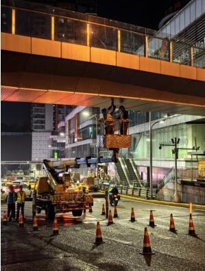 天橋位于商業(yè)區(qū),天橋上下人流、車流量較大,且天橋外側(cè)加裝了鋁板裝飾層,無形中為現(xiàn)場檢測工作帶來了難度。為盡快完成本次檢測,同時減少現(xiàn)場檢測工作給游客及交通帶來的影響,本次檢測選擇在夜晚進(jìn)行。我司組織了在檢測、鑒定領(lǐng)域具有豐富經(jīng)驗的專家及檢測人員進(jìn)駐現(xiàn)場,在最短時間完成了檢測方案編寫、天橋計算分析、交通占道方案審批、現(xiàn)場檢測工作準(zhǔn)備以及橋梁外觀檢查、靜載和動載試驗以及欄桿推力試驗,圓滿完成檢測任務(wù),為天橋結(jié)構(gòu)的安全提供了有力的技術(shù)保障,為橋上打卡游客的人身安全保駕護(hù)航。