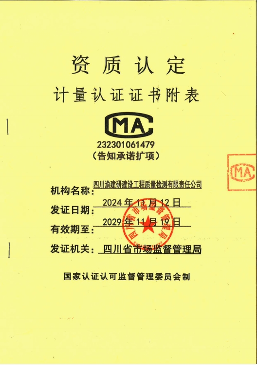 以此次資質(zhì)擴增為契機,四川渝建研公司將繼續(xù)秉承“檢測公正、方法科學(xué)、管理嚴(yán)格、服務(wù)及時”的質(zhì)量方針,充分發(fā)揮人才、技術(shù)資源優(yōu)勢,不斷提升技術(shù)實力、持續(xù)優(yōu)化服務(wù)水平、深入擴大經(jīng)營力度,同聲唱好“雙城記”、攜手共建“經(jīng)濟圈”,為打造一流檢測品牌、共繪成渝區(qū)域繁榮新畫卷貢獻(xiàn)力量。