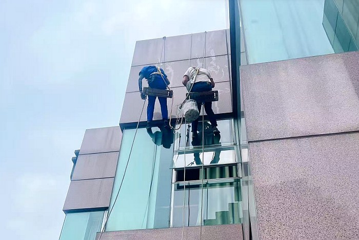 考慮到建筑高度約140米,屋面設備布置密集且作業(yè)空間有限,經多方案論證,最終選用“蜘蛛人”高空作業(yè)方式,并通過搭設腳手架安全通道、設置圍擋區(qū)域,地面配備專職安全管理員進行風險預判與人流疏導的方式,構建起全方位、立體化的安全防護網絡,切實保障了解放碑商圈游客與行人安全。在近兩個月作業(yè)期間,無論是酷暑還是陰雨天氣,市建科院檢測團隊始終堅持作業(yè),嚴控質量、保障進度,如期順利完成了全部檢測任務。