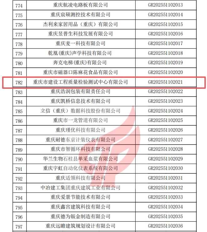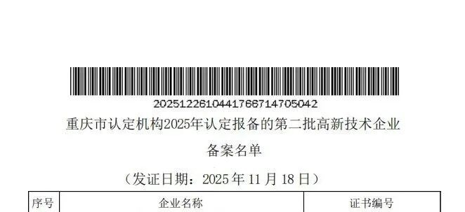 近日,全國高新技術(shù)企業(yè)認(rèn)定管理工作領(lǐng)導(dǎo)小組辦公室正式發(fā)布《對重慶市認(rèn)定機(jī)構(gòu)2025年認(rèn)定報(bào)備的第二批高新技術(shù)企業(yè)進(jìn)行備案的公告》,重慶設(shè)計(jì)集團(tuán)市建科院所屬子企業(yè)重慶市建設(shè)工程質(zhì)量檢驗(yàn)測試中心有限公司,獲評“國家高新技術(shù)企業(yè)”。